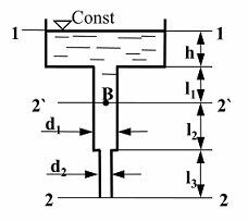 Определить расход воды, вытекающей из трубы, и манометрическое давление в точке В (см рис. 11). Уровень в резервуаре постоянный, глубина h = 5 м. Длина участков верхней трубы диаметром d1 = 150 мм равна l1 = 4 м и l2 = 10 м. Длина нижней трубы диамет