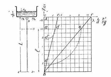 Главная » Учебные материалы » Механика жидкости и газа (МЖГ или Гидравлика) » Решения задач » Несколько классов/семестров » Номер 57 » Из открытого резервуара, достаточно больших размеров, вытекает вода по вертикальной трубе. Глубина воды в резервуаре h=1,20 м; длина трубы L=12,8 м, диаметр трубы d=0,1 м. В верхнем конце трубы имеется задвижка. Исследовать движение воды (рис. 90).