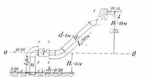 На рисунке 99 изображена схема турбинной установки. Из напорного бассейна А железным клепанным трубопроводом (длина L=30 м.; диаметр d=1,0 м.) вода подводится к турбине Т, находящейся в цилиндрическом кожухе. Пройдя рабочее колесо турбины, вода посту
