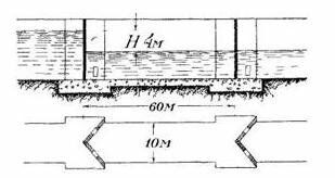 Главная » Учебные материалы » Механика жидкости и газа (МЖГ или Гидравлика) » Решения задач » Несколько классов/семестров » Номер 73 » Шлюзовая камера имеет ширину 10 м и длину 60 м. В верхних и нижних воротах устроено по два прямоугольных отверстия размером 0,8∙1,6 м. Определить время наполнения и опорожнения камеры. если горизонт верхнего бьефа на 4 м. выше горизонта нижнего бьефа