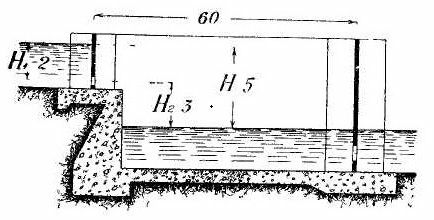 Главная » Учебные материалы » Механика жидкости и газа (МЖГ или Гидравлика) » Решения задач » Несколько классов/семестров » Номер 75 » Шлюзовая камера имеет ширину 6 м. и длину 60 м. Разность горизонтов бьефов составляет H=5 м. Верхние отверстия находятся на H1=2 м. ниже уровня верхнего бьефа. В камере имеется стенка падения. Определить размеры верхних отверстий, если камера должна