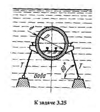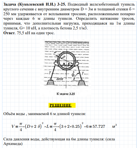 Подводный железобетонный туннель круглого сечения с внутренним диаметром D = 3м и толщиной стенки б = 250 мм удерживается от всплывания тросами, расположенными попарно через каждые 6 м длины туннеля. Определить натяжение тросов, принимая, что дополнительная нагрузка, приходящаяся на 1м длины туннеля, G= 10 кH, а плотность бетона 2,5 т/м3.