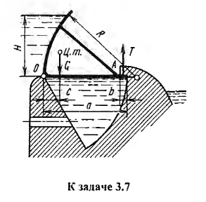 Пренебрегая трением в опорах вращения, определить усилие T, которым затвор прижимается к уступу А плотины (приходящееся на 1м длины затвора), если масса 1м длины затвора равна 1 T; размеры a=4 м и b=0,3 м, плечо центра тяжести затвора c = 0,6 м.