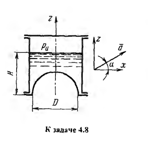 Задача 4.8 Закрытый цилиндрический сосуд диаметром D = 0,6 м, имеющий полусферическое дно, наполнен до уровня H = 0,8 м водой и движется прямолинейно под углом α = 30 к горизонту c постоянным ускорением a = 2g.