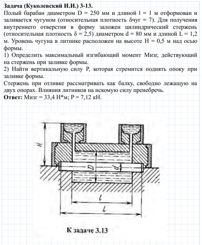 Полый барабан диаметром D = 250 мм и длиной l = 1 м отформован и заливается чугуном (относительная плотность δчуг = 7). Для получения внутреннего отверстия в форму заложен цилиндрический стержень (относительная плотность δ = 2,5) диаметром d = 80 мм и длиной L = 1,2 м. Уровень чугуна в литнике расположен на высоте H = 0,5 м над осью формы.1) Определить максимальный изгибающий момент Mизг, действующий на стержень при заливке формы.