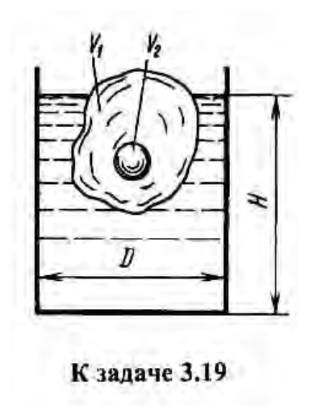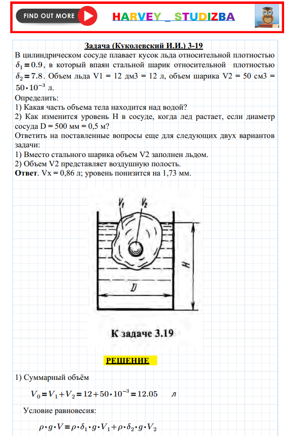 Задача (Куколевский И.И.) 3-19 В цилиндрическом сосуде плавает кусок льда относительного веса δ1 = 0,9, в который впаян стальной шарик относительного веса δ2 = 7,8. Объем льда V1 = 12 дм3, объем шарика V2 = 50 см3.