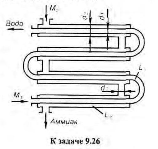 Противоточный переохладитель для аммиака выполнен в виде четырех последовательных секций, каждая из которых образована двумя концентрическими трубами. По внутренней трубе, диаметр которой d1 = 30 мм и толщина стенки 2,5 мм, течет вода, по междутрубному пространству – жидкий аммиак (диаметр внешней трубы d2 = 50 мм). Общая длина внутренней трубы L1 = 22 м, длина каждой секции L2 = 4 м, диаметр соединительных патрубков между секциями d3 = 35 мм.