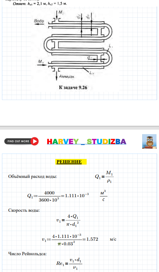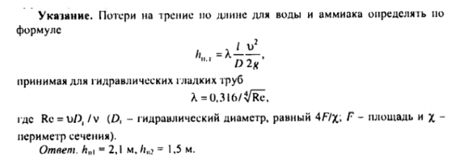 Определить потери напора в переохладителе для воды hп1, и аммиака hп2, если массовый расход воды M1 = 4000 кг/ч (ν = 1,2 ∙ 10-2 Ст) и аммиака M2 = 2200 кг/ч (относительная плотность δ = 0,61 и динамическая вязкость μ = 0,225 ∙ 10-2 П при t = 20 ℃).