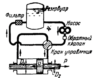 Определить мощность шестеренчатого насоса, используемого в объемной гидропередаче для переме­щения поршня гидроцилиндра, если внешняя нагрузка поршня при ра­бочем ходе (справа налево) Р=500 кГ, скорость рабочего хода V=0,15 м/сек, диаметр поршня D1=50 мм, диаметр штока D2=20 мм. Рабочая жидкость в системе - спиртоглицериновая смесь с удель­ным весом у = 1210 кГ/м3 и ки­нематическим коэффициентом вяз­кости V=1,2 см2/сек. Общая длина трубопроводов системы l=11 м, диаметр d=10 мм. Местные потери в обратном клапане, кране управления и фильтре выражаются через относительные эквивалентные длины труб, равные соответственно lэ/d=50, 40, 60. Какова мощность насоса при обратном ходе поршня, если преодолеваемое при этом усилие равно 100 кГ? Указание. Напор насоса в данной установке равен сумме пе­репада пьезометрических напоров по обе стороны поршня и потерь напора в трубопроводах.