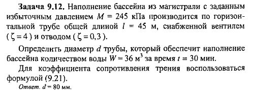 Наполнение бассейна из магистрали с заданным избыточным давлением M = 245 кПа производится по горизонтальной трубе общей длиной l = 45 м...