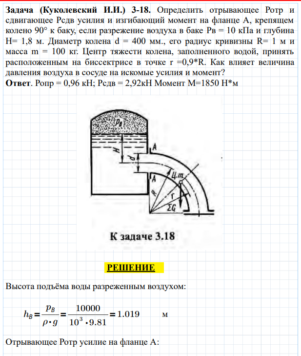 Определить отрывающее Ротр и сдвигающее Рсдв усилия и изгибающий момент на фланце А, крепящем колено 90° к баку, если разрежение воздуха в баке Pв = 10 кПа и глубина H= 1,8 м. Диаметр колена d = 400 мм., его радиус кривизны R= 1 м и масса m = 100 кг. Центр тяжести колена, заполненного водой, принять расположенным на биссектрисе в точке r =0,9*R. Как влияет величина давления воздуха в сосуде на искомые усилия и момент?