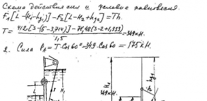 Прямоугольный поворотный щит размером L*B = 3*4 м закрывает выпускное отверстие плотины. Справа от щита уровень воды H1 = 5 м, а слева H2 = 2 м.Определить: 1) Начальную силу Т натяжения тросов, необходимую для открытия щита.