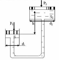 Главная » Учебные материалы » Механика жидкости и газа (МЖГ или Гидравлика) » Решения задач » Несколько классов/семестров » Номер 8 » Вариант 9 » Какую силу P2 необходимо приложить к большему поршню, чтобы система находилась в равновесии? Трубки заполнены водой, весом поршней пренебречь. Дано: P1=200 Н; d1=30 мм; d2=200 мм; h=400 мм.