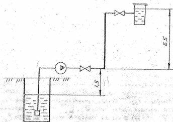 Центробежный насос забирает воду с температурой t=5,5 °С. Из колодца с уровнем воды на 1,5 м ниже уровня насоса и подает ее в количестве G=12 кг/с в сосуд с отметкой уровня воды в нем 6,5 м. В сосуде поддерживается постоянное избыточное давление P=1,8 МПа. После насоса на нагнетательном трубопроводе установлены 2 вентиля. Определить напор насоса и выбрать его тип, если диаметры и длины всасывающего и напорного трубопроводов равны: d1=125 мм, l1=6,5 м, d2=100 мм, l2=18 м. Коэффициент полезного действия ηуст=0,67. Коэффициент сопротивления трения , всасывающей коробки ξк=4, вентиля ξв=5.