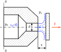 Для сопла-заслонки, изображенной на схеме, определить силу, с которой жидкость (вода) воздействует на заслонку в следующих случаях: 1) когда заслонка плотно прижата к торцу сопла (x = 0) и истечения жидкости не происходит и 2) когда расстояние x достаточно велико и истечение происходит так, как показано на схеме. Давление в широкой части сопла (сечение 0-0) p0 = 3 МПа, скорость v0 = 0 в обоих случаях. Диаметр выходного канала сопла d = 2 мм, а коэффициент расхода μ = ϕ = 0,85.