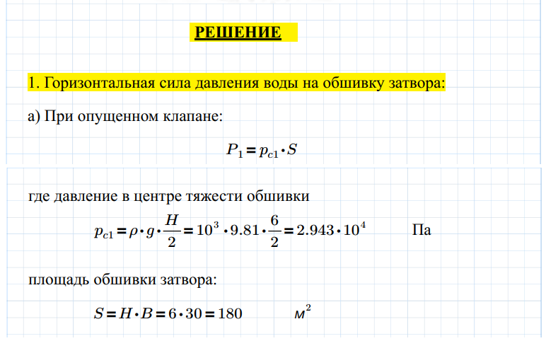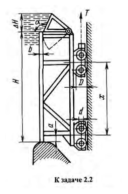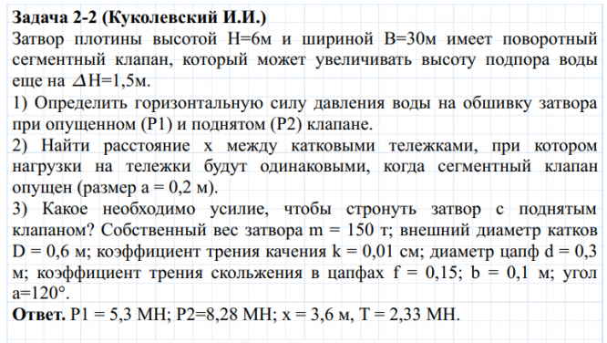 Затвор плотины высотой H = 6 м и шириной B = 30 м имеет поворотный сегментный клапан, который может увеличивать высоту подпора воды еще на ΔH = 1,5 м. 1) Определить горизонтальную силу давления воды на обшивку затвора при опущенном (P1) и поднятом (P2) клапане. 2) Найти расстояние x между катковыми тележками, при котором нагрузки на тележки будут одинаковыми, когда сегментный клапан опущен (размер a = 0,2 м). 3) Какое усилие T необходимо приложить, чтобы стронуть затвор с поднятым клапаном? Масса затвора m = 150 т; внешний диаметр катков D = 0,6 м; коэффициент трения качения k = 0,01 м; диаметр цапф d = 0,3 м; коэффициент трения скольжения в цапфах f = 0,15; b = 0,1 м; угол α = 1200..