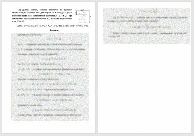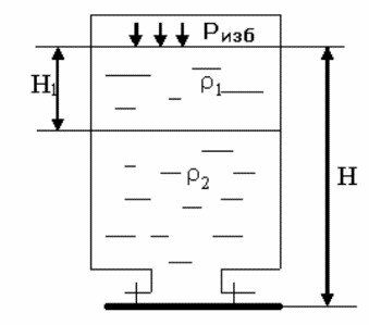 Определить усилие, которое действует на крышку, закрывающую круглый люк диаметром D, в сосуде с двумя несмешивающимися жидкостями плотностью ρ1 и ρ2 при давлении на свободной поверхности Ризб и высоте жидкостей Н, если Н1=α∙Н. Дано: D=300 мм; Н=5 м;