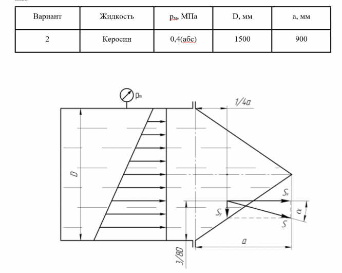 Главная » Учебные материалы » Механика жидкости и газа (МЖГ или Гидравлика) » Решения задач » Несколько классов/семестров » Номер 2 » Вариант 2 » Определить силу давления на коническую крышку горизонтального цилиндрического сосуда диаметром D, заполненного жидкостью Ж. Показания манометра в точке его присоединения – рм