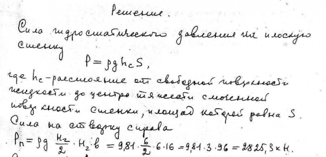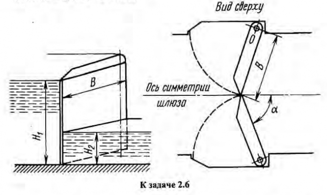 Двустворчатые ворота отгораживают шлюзовую камеру от канала с низовой стороны шлюза. При заполненном шлюзе вода по обе стороны ворог находится на уровнях H1=18 м и H2 = 6 м. Найти равнодействующую Р сил давления воды на каждую из створок ворог. На какой высоте х от дна проходит линия действия силы Р?