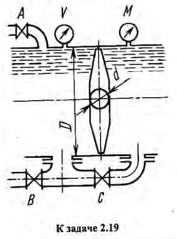 Перед затвором давление измеряется манометром М, установленным (так же, как и вакуумметр) в верхней точке трубопровода. Трубопровод за затвором можно опорожнить открытием вентиля В при одновременном впуске воздуха через трубу А и закрытом вентиле С, тогда вакуум V за затвором будет равен нулю. Считать боковую поверхность диска затвора плоской.