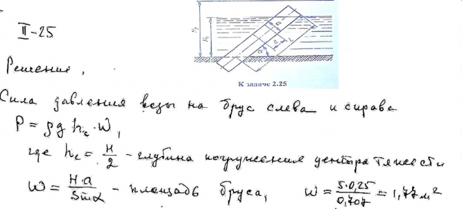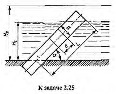 Определить результирующее воздействие давления воды на брус квадратного сечения со стороной а = 0,4 м, выступающий из непроницаемого грунта над поверхностью воды; глубина дна Н1 = 5 м, угол наклона бруса а = 45°.Найти равнодействующую Р сил давления на этот же брус длиной L = 8 м при глубине дна Н1 = 6 м (весь брус под водой).