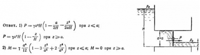 Слева от квадратного дискового затвора размером а*a уровень воды постоянен (H), а справа переменен (z). Выразить в зависимости от z суммарную гидравлическую силу Р, действующую на затвор, и ее момент M относительно оси вращения затвора, проходящей через его центр тяжести. Указать наибольшие значения Р и М в интервале 0..