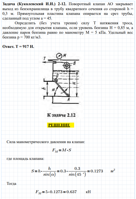 Определить (без учета трения) силу Т натяжения троса, необходимую для открытия клапана, если уровень бензина H = 0,85 м, а давление паров бензина равно по манометру М = 5 кПа. Удельный вес бензина р = 700 кг/м3.