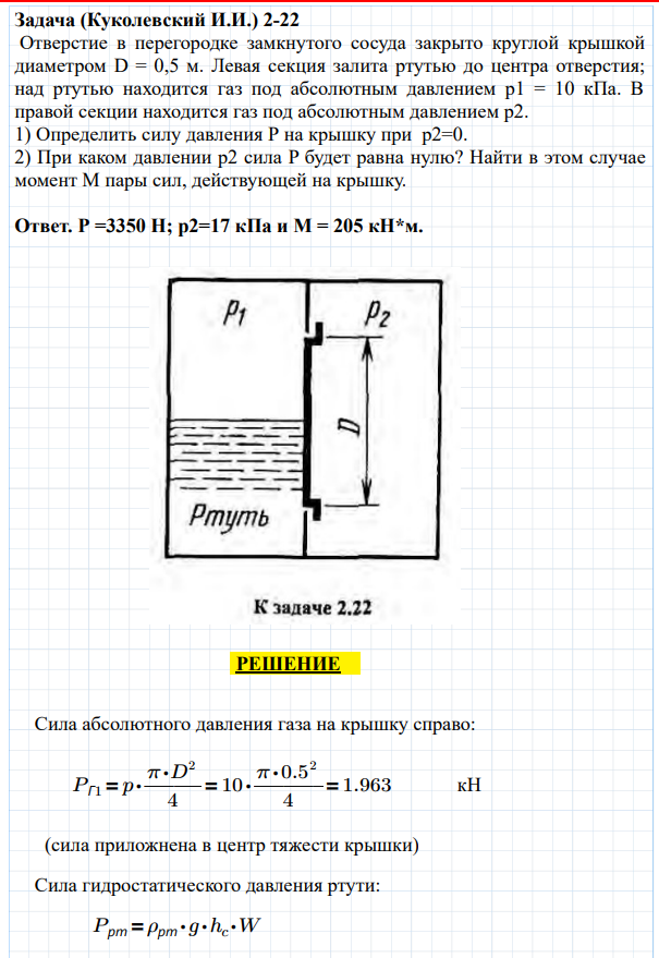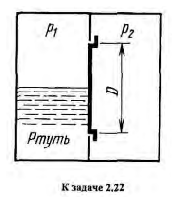 Отверстие в перегородке замкнутого сосуда закрыто круглой крышкой диаметром D = 0,5 м. Левая секция залита ртутью до центра отверстия; над ртутью находится газ под абсолютным давлением р1 = 10 кПа. В правой секции находится газ под абсолютным давлением р2.