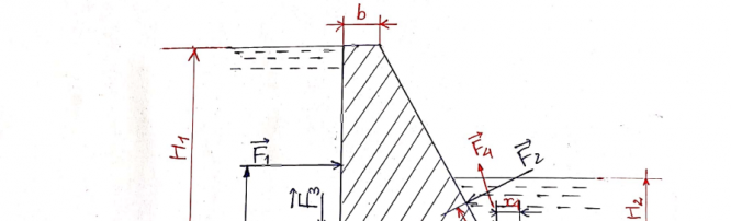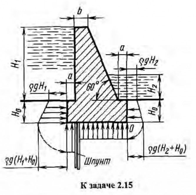 Бетонная плотина имеет следующие размеры: Н1= 12 м, H0 = 3 м, а=1 м, b = 2 м; уровень воды с низовой стороны H2 = 3 м. Так как грунт под плотиной водопроницаем, в него для предотвращения перетока воды забит шпунт. Проверить устойчивость плотины, найдя суммарный опрокидывающий М0 и восстанавливающий М0 моменты относительно точки О с учетом давления воды на подгрунтовую часть плотины (см. эпюру на эскизе). Все расчеты проводить на единицу длины плотины. Восстанавливающий момент от силы веса плотины в расчете на 1 м ее длины равен М0=13250 кН*м/м.