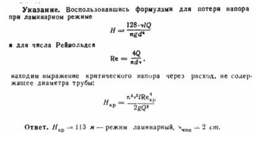 Задача (Куколевский И.И.) 5-20. Установить режим течения нефти (V = 2,5 ст) по трубопроводу длиной l = 1 000 м, который при располагаемом статическом напоре H = 40 м должен пропускать расход Q =60 л/сек. Найти минимальное значение Reкр, при котором в трубопроводе будет еще ламинарный режим, приняв Rекр = 2000.