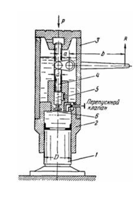 Задача (Куколевский И.И.) 1-21. Гидравлический домкрат состоит из неподвижного поршня 1 и скользящего но нему цилиндра 2, на котором смонтированы корпус 3 (образующий масляную ванну домкрата) и плунжерный насос 4 ручного привода со всасывающим 5 и нагнетательным 6 клапанами.