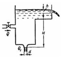 Задача (Куколевский И.И.) 6-25. Для поддержания практически постоянного расхода через сопло диаметром d = 120 мм при колебаниях подачи воды в бак, к последнему присоединен прямоугольный водослив с тонкой стенкой. Порог водослива расположен выше кромки сопла на H = 3 м, ширина водослива В = 0,7 м, боковое сжатие отсутствует.