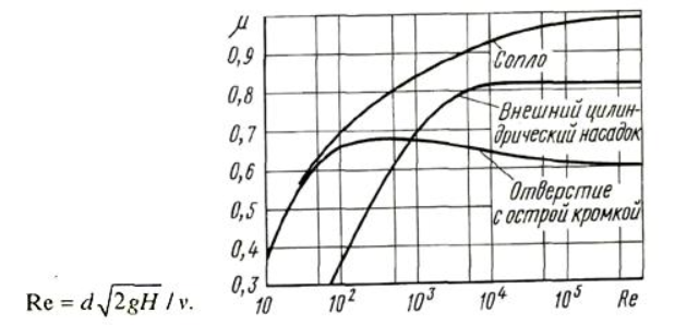 Задача (Куколевский И.И.) 6.27. Сравнить расходы жидкости через отверстие с острой кромкой, внешний цилиндрически» насадок и коноидальный насадок (сопло) одинакового диаметра H = 10 мм при одинаковом напоре истечения H = 5 м и двух значениях кинематической вязкости жидкости v = 1 и 1000 сСт. Воспользоваться приведенными кривыми зависимости коэффициента расхода отверстия, насадка и сопла от числа Рейнольдса