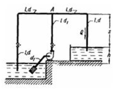 Задача (Куколевский И.И.) 14-29. Центробежный насос перекачивает воду по трубопроводу (l = 5 м, d1 = 75 мм), который в точке А разветвляется на две линии диаметром d = 50 мм и длиной 2*l каждая. Расход в правой ветви Q = 10 л/с, а высоты равны h = 1 м, z = 4м. Определить мощность насоса Nи, принимая коэффициент сопротивления трения в трубах ? = 0,03, суммарный коэффициент сопротивления всасывающей линии ?ВС = 10 и пренебрегая потерями и задвижках. Указать сечение трубопровода, в котором имеет места наименьшее давление.