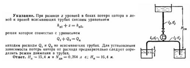 Задача (Куколевский И.И.) 14-31. Роторный насос, подача которого Qн = 1 л/сек, нагнетает масло в верхний бак из двух баков с одинаковыми уровнями. Всасывающие трубы имеют равные диаметры d] = d2 = 20 мм и равные приведенные длины l1 = l2 = 4 м. Диаметр и приведенная длина нагнетательной трубы d3 = 20 мм и l3 = 6 м. Определить напор насоса Нп и мощность двигателя N подъема Hст = 5 м, масла V=0,5 см2/сек, его удельный вес у=900 кГ/м3 и к. п. д. насоса 0,7. Как изменится напор насоса, если уровень в левом баке будет ниже, чем в правом, на z = 2 м? ![]()