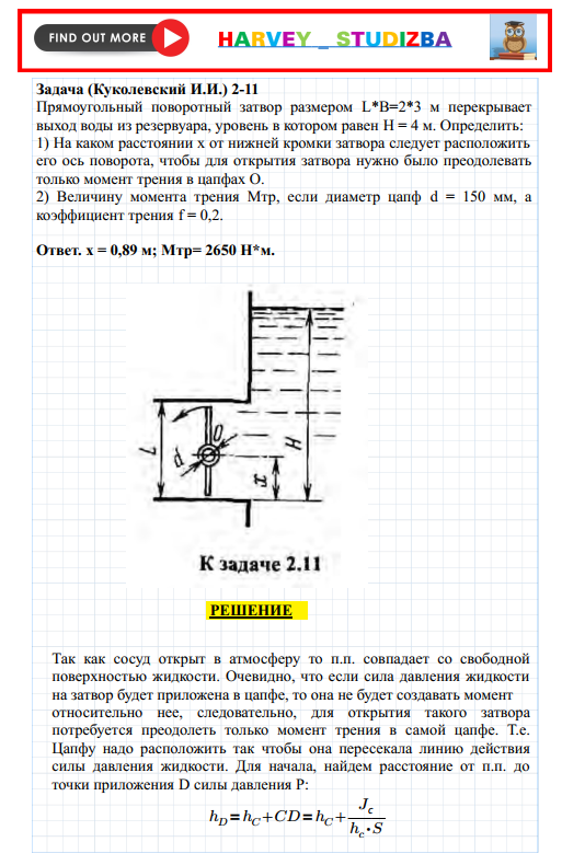 1. Определить, на каком расстоянии x от нижней кромки затвора следует расположить его ось поворота, чтобы для открытия затвора нужно было преодолевать только момент трения в цапфах О.