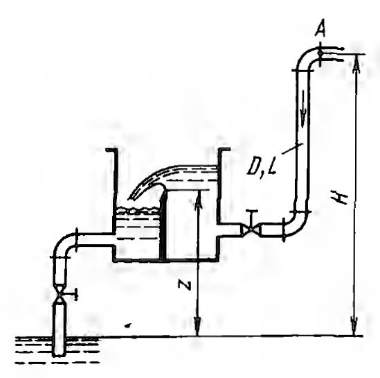 Определить, на какой высоте z от нижнего уровня следует поместить порог водослива, чтобы при расходе Q = 80 л/с вакуумметрическая высота в точке A не превосходила 6 м. Длина участка трубопровода от точки A до затвора L = 12 м, коэффициент сопротивления открытой задвижки ξ3 = 0,15 и каждого из отводов ξо = 0,2. Коэффициент сопротивления трения в трубе принять λ = 0,02. Ширина порога водослива B = 500 мм, его коэффициент расхода принять m = 0,41.