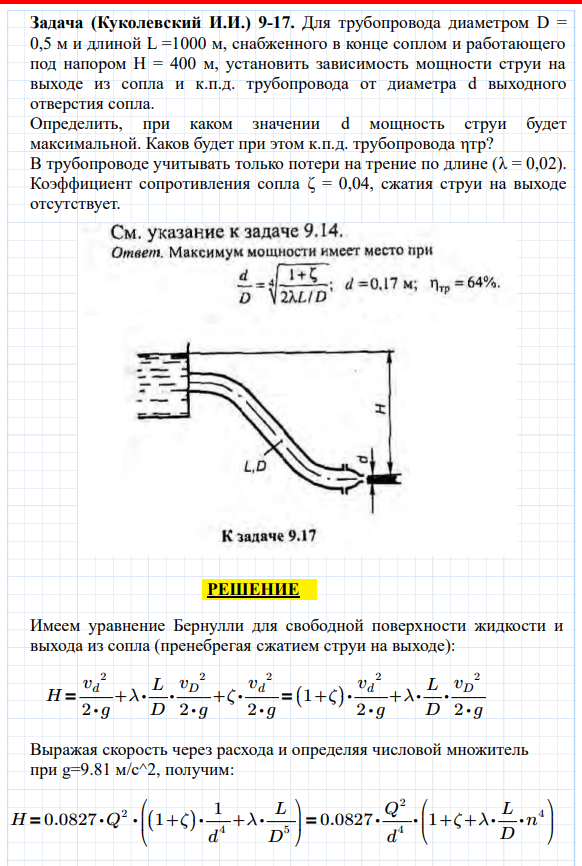 Для трубопровода диаметром D = 0,5 м и длиной L =1000 м, снабженного в конце соплом и работающего под напором Н = 400 м, установить зависимость мощности струи на выходе из сопла и к.п.д. трубопровода от диаметра d выходного отверстия сопла. Определить, при каком значении d мощность струи будет максимальной. Каков будет при этом к.п.д. трубопровода ηтр?