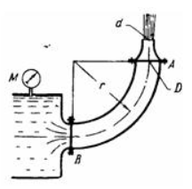 Задача (Куколевский И.И.) 13-6. Определить гидравлические нагрузки болтовых групп во фланцевых соединениях А и В при истечении воды из бака через отвод и присоединенный к нему насадок. Выходной диаметр насадка d = 50 мм, диаметр отвода D = 100 мм и его радиус кривизны r = 400 мм. Избыточное давление в баке М = 1 МПа. Гидравлическими сопротивлениями и весом жидкости в отводе пренебрегать. Как изменится нагрузка болтов В, если удалить насадок?
