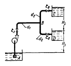 2. Каков должен быть коэффициент сопротивления вентиля на трубе ВD, чтобы подача в оба бака стала одинаковой; какова при этом подача насоса?