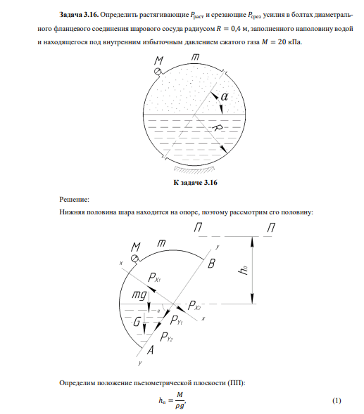 Определить усилия, растягивающие и срезающие болты диаметрального фланцевого соединения шарового сосуда радиусом R = 0,4 м, заполненного наполовину водой и находящегося под внутренним давлением сжатого газа М = 20 кПа. Плоскость стыка наклонена к горизонту под углом а =45°, вес полушара m = 300 кг.