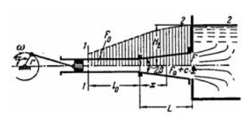 Задача (Куколевский И.И.) 12-3. Поршень, приводимый в движение кривошипно-шатунным механизмом, перемещает жидкость в трубе, заканчивающейся расходящимся коническим насадком, подключенным к резервуару, где уровень жидкости постоянен. Определить давление у поршня в тот момент, когда он находится в крайнем правом положении (а =180°), и построить пьезометрическую линию для этого момента времени.