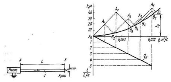 Задача (Куколевский И.И.) 12.30. К насосу подключен горизонтальный трубопровод длиной l = 12м, диаметром d = 125 мм с краном на конце. Кран частично открыт так, что его коэффициент расхода 0,031. При включении насоса его подача нарастает по прямой от нуля до q0=10 л/с за время l= 0,05 с. Скорость ударной волны а = 1200 м/с, Определить закон изменения давления у насоса (сечение А) по времени. Трением в трубе пренебречь. ![]()