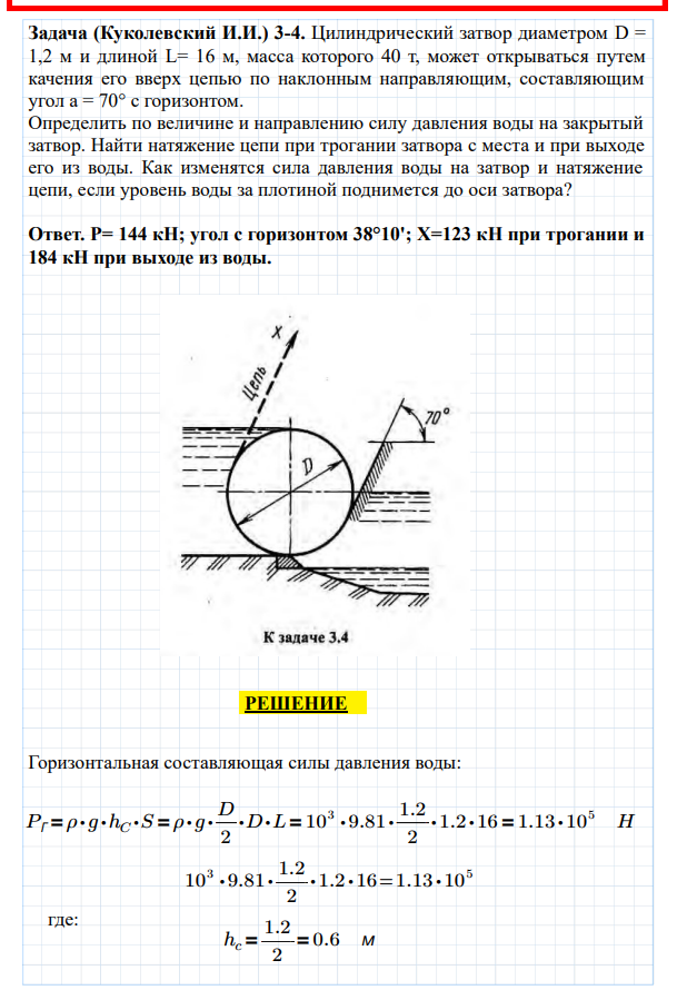 Определить по величине и направлению силу давления воды на закрытый затвор. Найти натяжение цепи при трогании затвора с места и при выходе его из воды. Как изменятся сила давления воды на затвор и натяжение цепи, если уровень воды за плотиной поднимется до оси затвора?