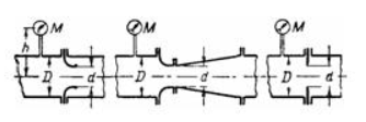 Задача (Куколевский И.И.) 7-33. Мерное сопло, расходомер Вентури и диафрагма, установленные в трубе D =100 мм, имеют одинаковый диаметр в свету d = 60 мм. Коэффициент сопротивления участка до сжатого сечения во всех приборах одинаков и равен ξ = 0,06, коэффициент потерь в диффузоре расходомера Вентури φД = 0,2. Коэффициент сжатия струи в диафрагма ε = 0,66. Сравнить потери напора во всех трех приборах при одинаковом расходе воды Q=16 л/с. Построить линии полного напора и пьезометрические линии при одинаковых показаниях манометров на входе в каждый прибор М = 100 кПа и высоте расположения манометров h=0,3 м. Определить наибольший расход Q, который при указанном М можно пропускать через каждый прибор, чтобы вакуум в сжатом сечении не превосходил 7 м.
