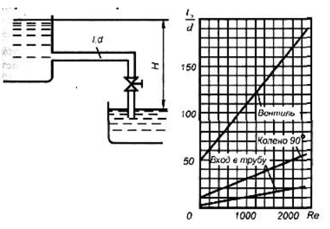 Задача (Куколевский И.И.) 9.48. Определить расход жидкости (кинематическая вязкость которой v = 0,5 Ст) до трубке размерами L = 10 м, d = 20 мм при располагаемом напоре H= 30 м. Для учета потерь напора в местных сопротивлениях (вход в трубку, колено 90° и нормальный вентиль) воспользоваться приведенными зависимостями относительных эквивалентных длин lэ/d этих местных сопротивлений от числа Рейнольдса Rе при ламинарном режиме течения в трубке. Указание. Задачу решить графически, построив характеристику трубопровода H =f(Q). Потерю напора при выходе жидкости из трубки в бак учесть с помощью состветегвуюшей эквивалентной шины, определяемой из общей формулы