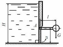Прямоугольный щиток размерами а×b может вращаться вокруг горизонтальной оси в точке А в указанном на рисунке направлении. Определить вес груза G на конце рычага длиной l=0,6 м, жестко прикрепленному к щитку, чтобы щиток автоматически закрывался при уровне воды в резервуаре Н=1,4 м. Размеры щитка а=0,3 м, b=0,4 м (рис. 9.2). Построить эпюру гидростатического давления.
