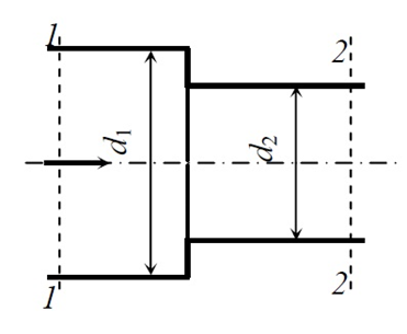 По трубопроводу, составленному из труб различного диаметра, перекачивается вода (рис. 9.6) при температуре t=20 ºС. Диаметр трубы в сечении 1-1 равен d1=0,08 м, в сечении 2-2 d2=0,06 м, средняя скорость в сечении 1-1 υ1=0,8 м/с. Определить среднюю скорость в сечении 2-2, режим течения жидкости. Какие параметры необходимо изменить, чтобы поменялся режим течения воды?