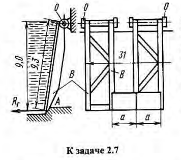 Стоечно-плоский затвор размером 9,3*31 м 2  состоит из попарно соединенных стоек В, вращающихся вокруг оси О. Пространство между стойками при опущенном их положении закрывается набором плоских щитов шириной а=1,8 м; для пропуска воды необходимое количество щитов поднимается вверх по стойкам..