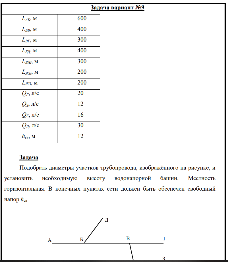 Задача: Подобрать диаметры участков трубопровода, изображённого на рисунке, и установить необходимую высоту водонапорной башни